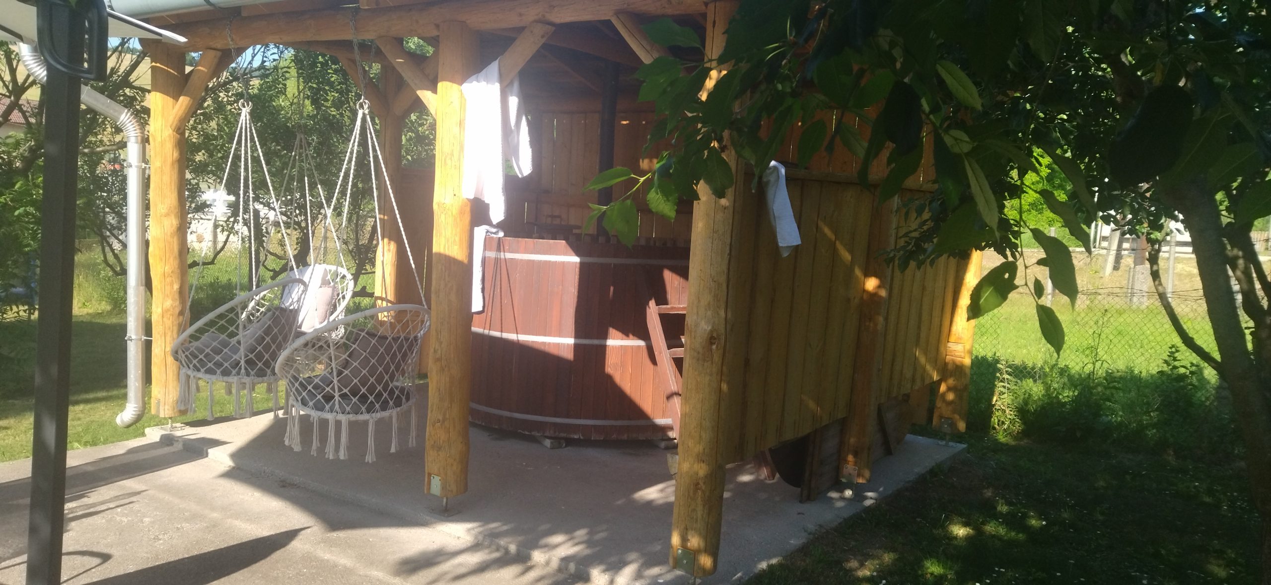 A fedett filagória alatt megbújó dézsafürdő igazi különleges élményt kínál minden évszakban. A meleg vízben ellazulva élvezhetitek a természet csendjét és a zavartalan pihenést, hiszen a dézsa teljesen védett az avatatlan tekintetek elől. Egy hosszú túra után, vagy egy hűvös estén nincs is jobb, mint elmerülni a kellemesen gőzölgő vízben. Itt a kikapcsolódás szó szerint körülölel